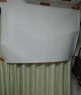 模造紙の置き方はもう少しおしゃれなやり方があるとは思うんですが、この画像くらい適当でも特に問題はありません。窓に近い割に、きちんと貼れば意外と剥がれてはきませんし。